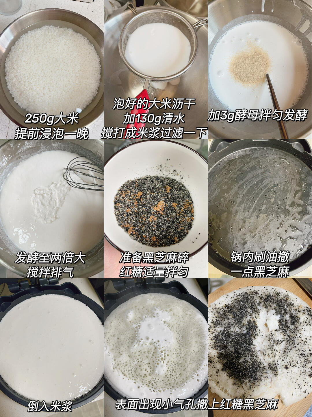 早上没有时间的,可以提前一晚上将大米浸泡至少4小时后,再搅打成米浆,加入酵母放冰箱里发酵,第二天早上起来直接可以煎了,几分钟就能搞定!